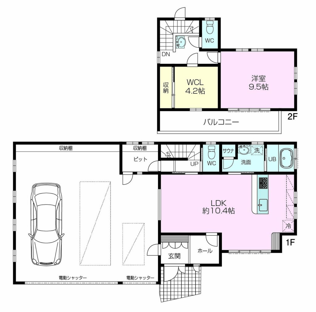 洋室9.5畳 2階 1室 S4.2畳 2階 1室 LDK10.4畳 1階 1室 その他40畳 1階 1室 ガレージ(66.1㎡) |